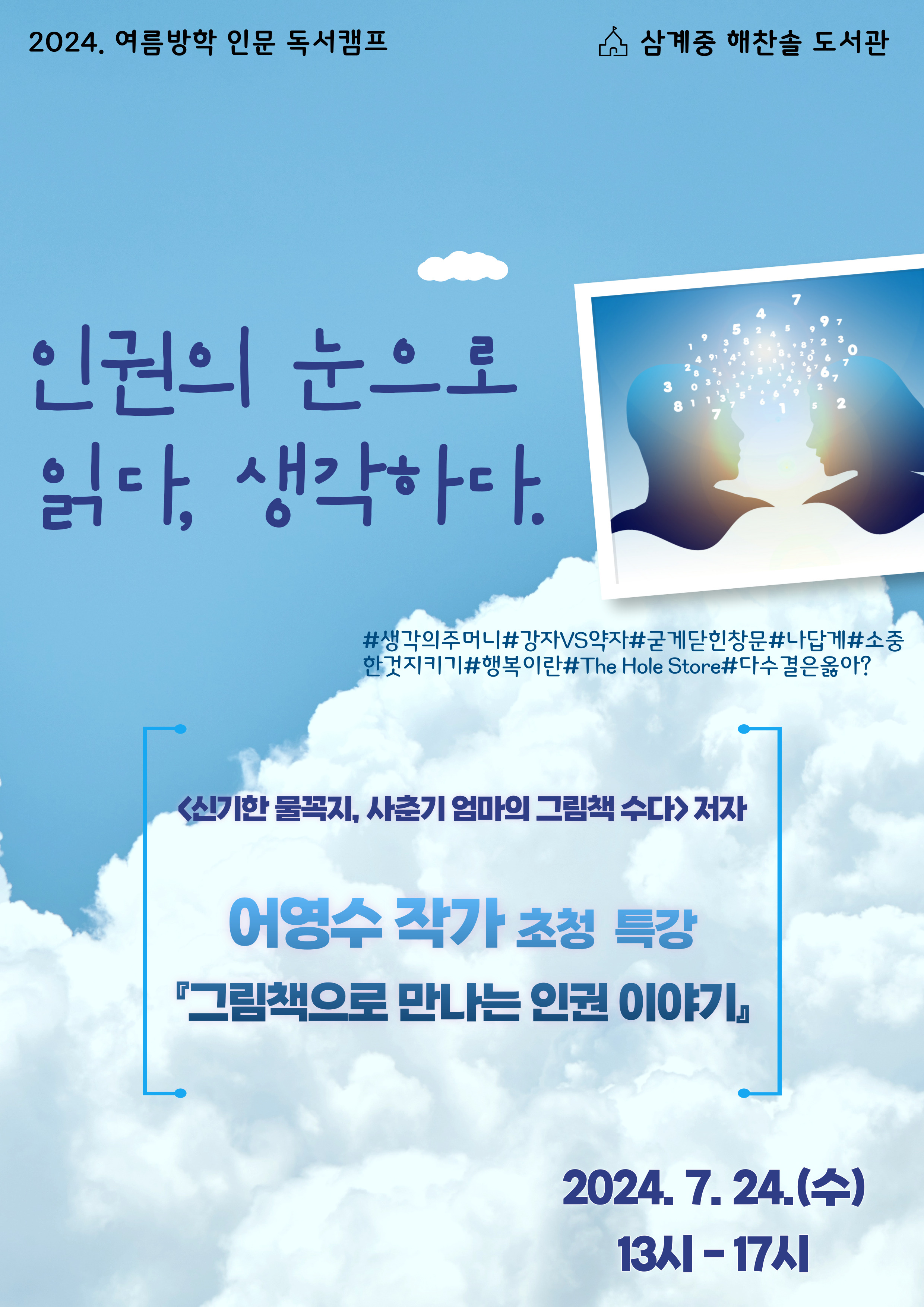 이번 여름방학 인문 독서캠프에서는 「신기한 물꼭지, 사춘기 엄마의 그림책 수다」의 저자, 어영수 작가의 특강이 함께 진행됩니다. 참여 원하시는 분께서는 7월 3일(수)부터 7월 10일(수)까지 삼계중 도서관(055-230-2764)으로 신청바랍니다. 주 제 | 인권의 눈으로 읽다, 생각하다! | 일 시 | 7월 24일(수요일) 13시~17시 | 대 상 | 전교생, 교직원 누구나 | 장 소 | 삼계중학교 3층 해찬솔 도서관 |