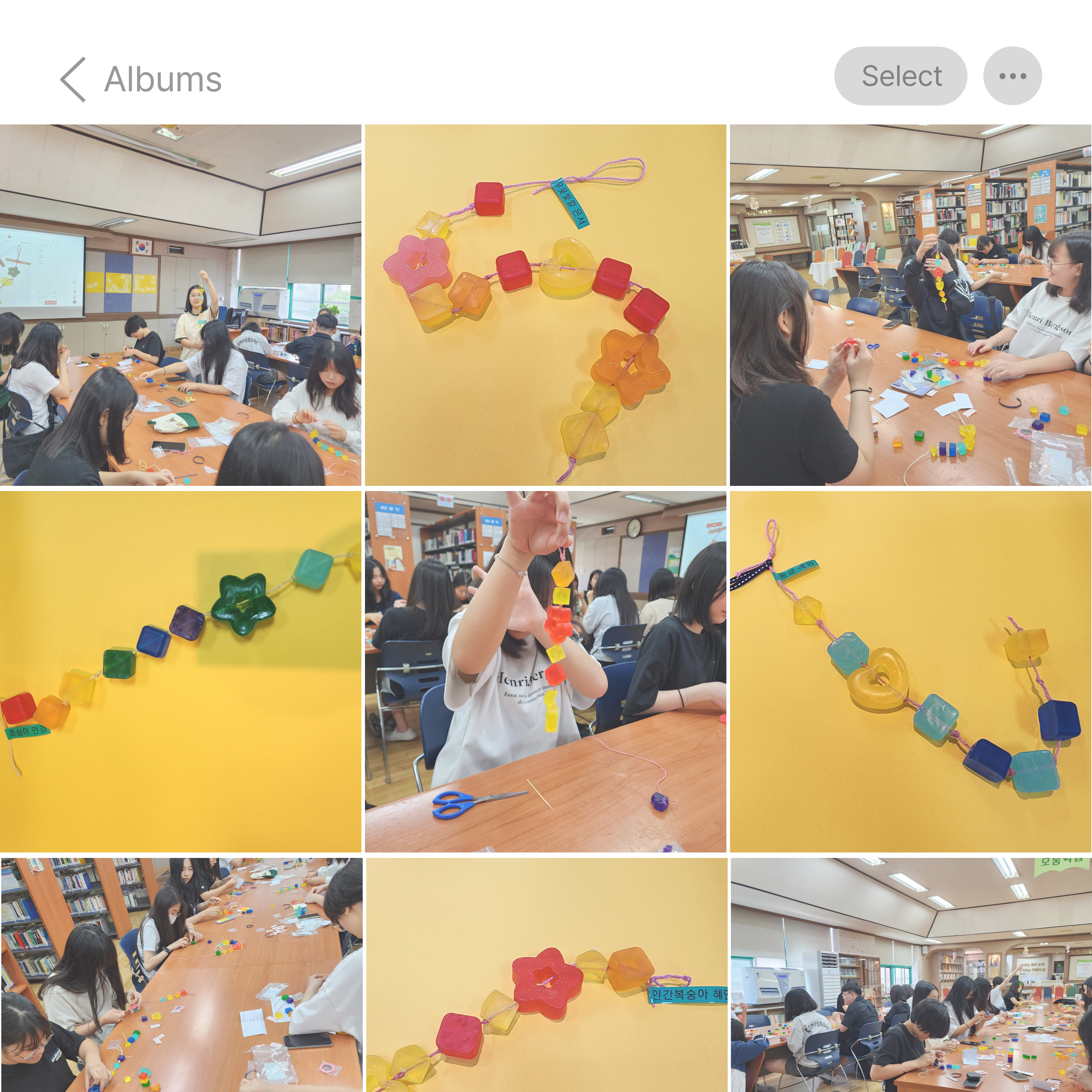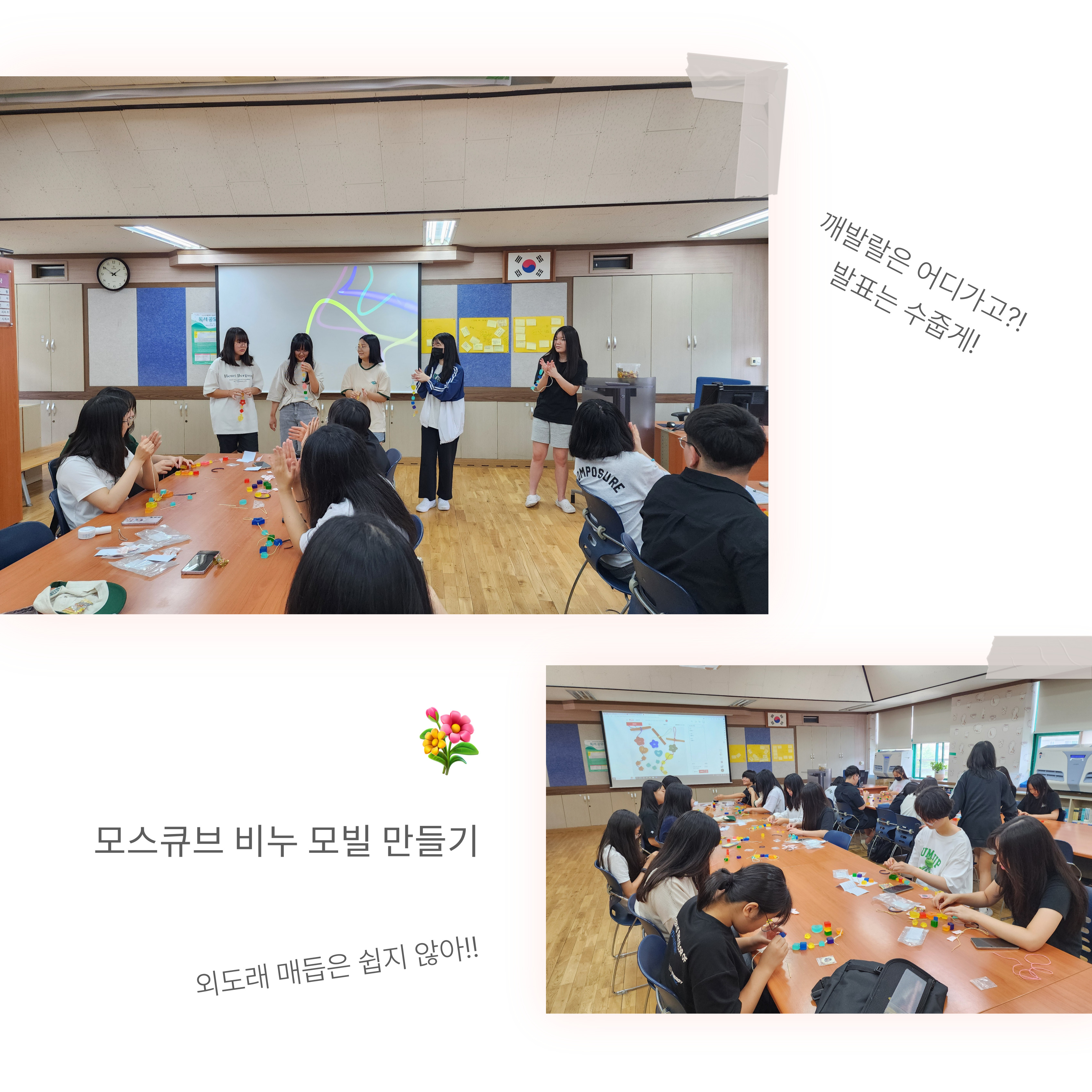 독서캠프 2탄은 사서 선생님과 함께하는 체험활동이었습니다. 모스큐브 비누 모빌 만들기를 함께하며 강한 향에 코끝이 찡하기도 하고, 매듭 묶기가 힘들어 도와달라고 손드는 아이들이 그저 귀여웠습니다.